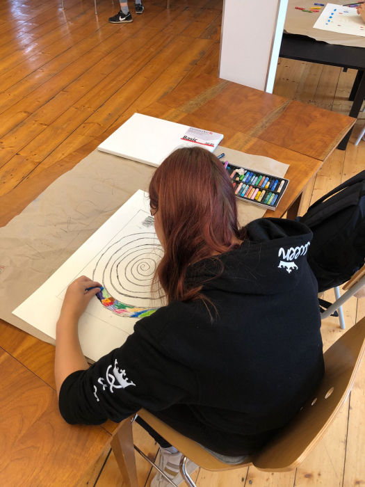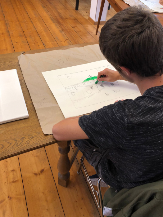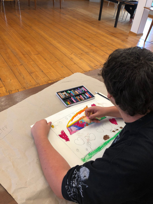 Im Atelier der Künstlerin wählte jede Schülerin und jeder Schüler ein eigenes Motiv und begann mit einer Skizze, die sie mit farbigen Wachsstiften ausarbeiteten.