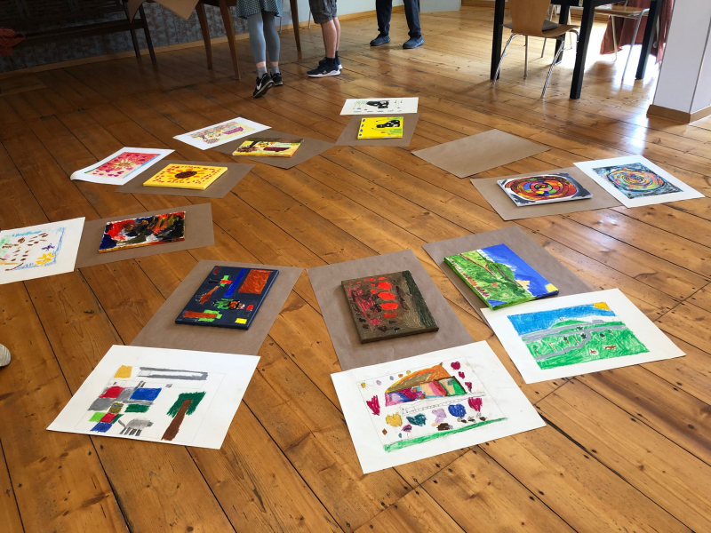 Gegen Ende des Malkurses legten sie ihre Skizzen und fertigen Bilder kreisförmig auf den Boden des Ateliers aus und stellten sich vor ihre Werke, um diese gemeinsam zu betrachten.