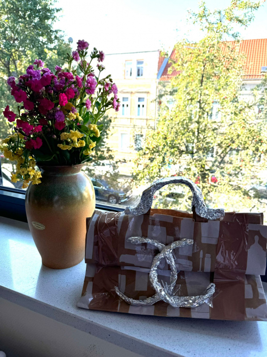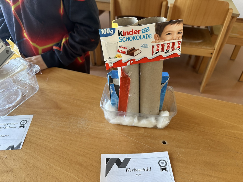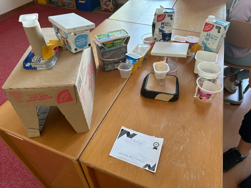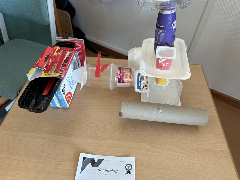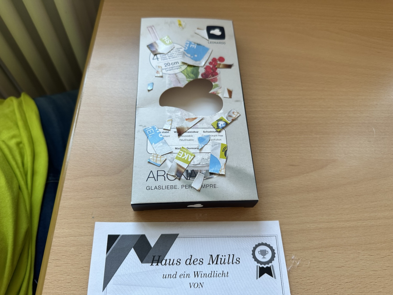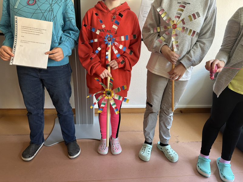 Die Schüler der Klasse 9 haben in der Nachhaltigkeitswoche Materialien aus dem Haushalt zusammengetragen, bauten Windmühlen aus Pfandflaschen und ein Windspiel aus Getränkekartons. Sie bastelten Windwurfscheiben aus Pappe. Zum Abschluss zeigten sie in der Präsentation, wie dick ein Windrad ist.