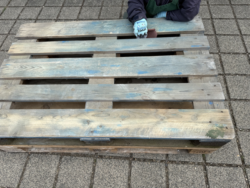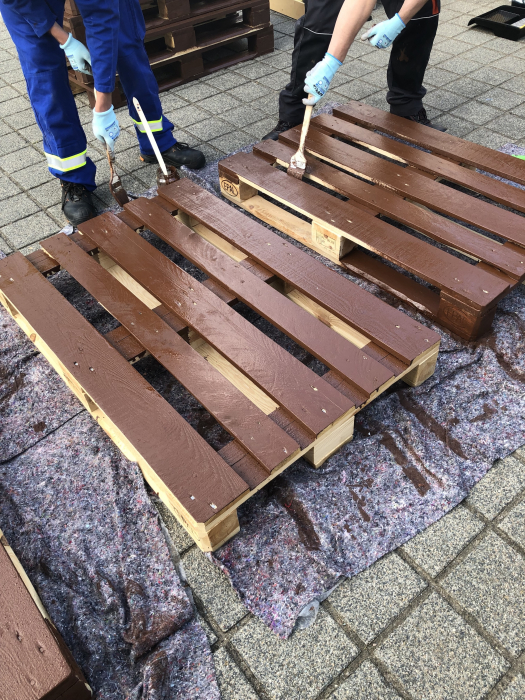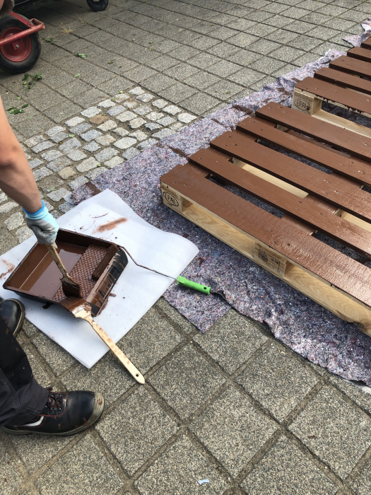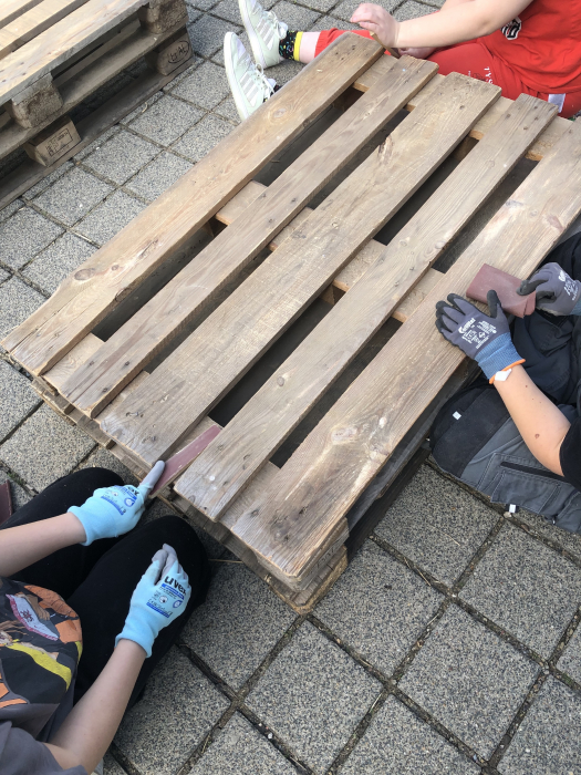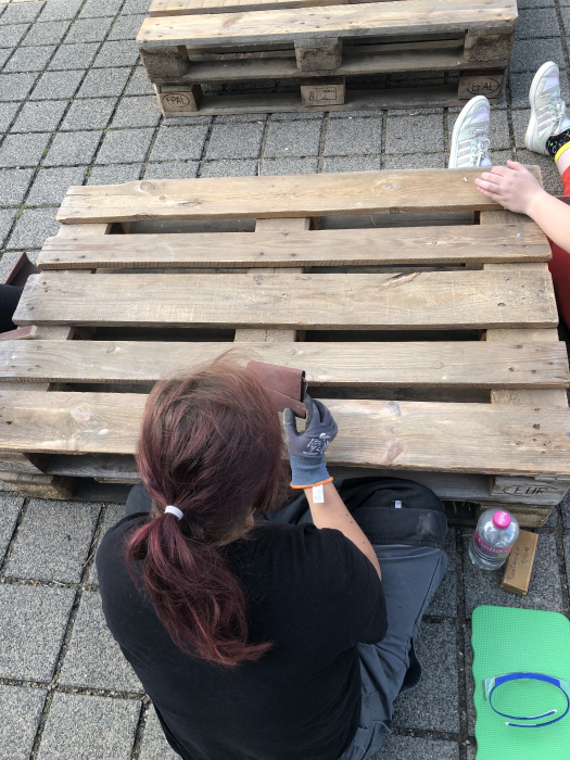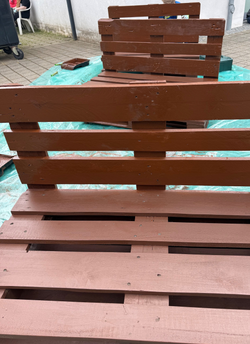 Neben den großen Projekten zeigten sich alle fleißigen Helfer auch von ihrer spontanen Seite. Paletten, die vom Vorjahr übrig waren, wurden kurzerhand zu neuen Sitzgelegenheiten für die Badelounge im Schulgarten umfunktioniert – natürlich frisch abgeschliffen und gestrichen. Und auch die alte Bank im Garten bekam ein farbliches Update – ein kleines Extra mit großer Wirkung.