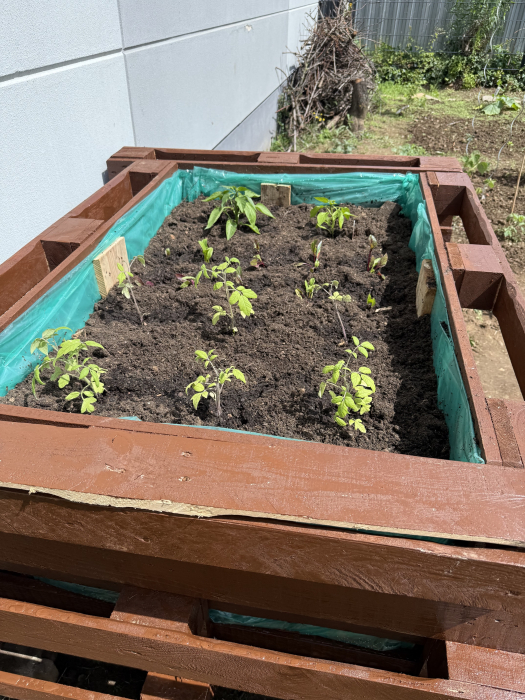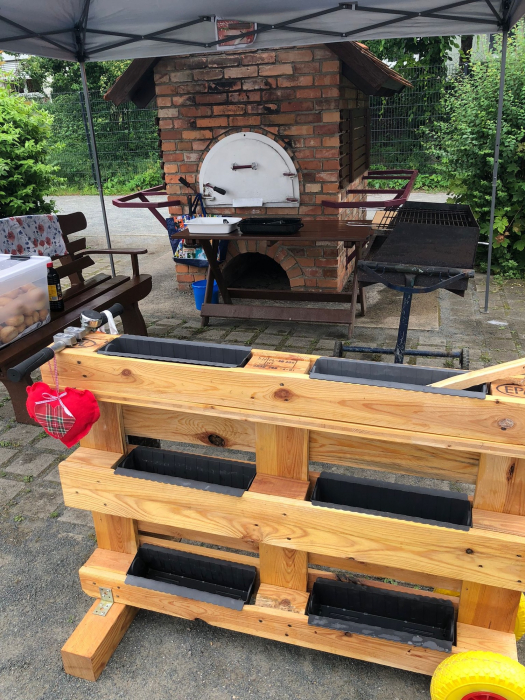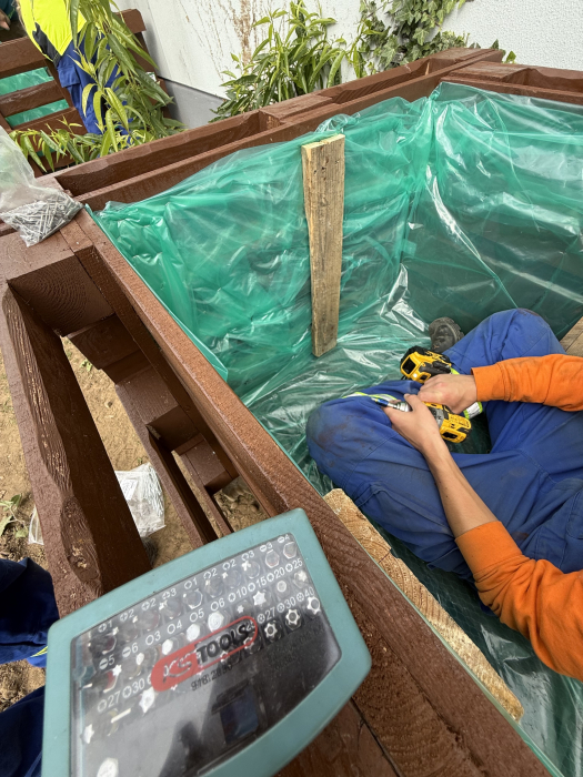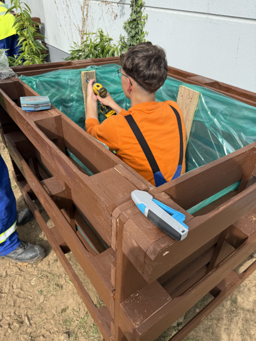 Mit viel Ausdauer und Teamarbeit entstanden zwei große Hochbeete aus Paletten, Schutzfolie und hochwertiger Pflanzerde. Die Schülerinnen und Schüler sowie die Azubis schliffen Paletten ab, behandelten sie mit wetterfester Farbe und setzten sie anschließend zu stabilen Beeten zusammen.