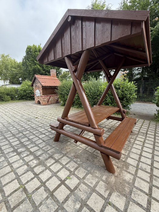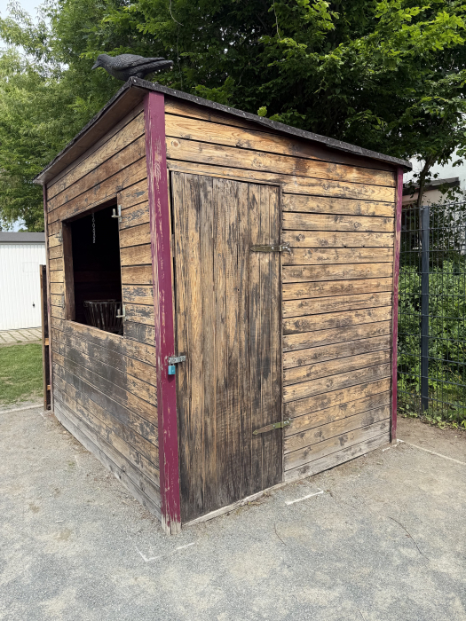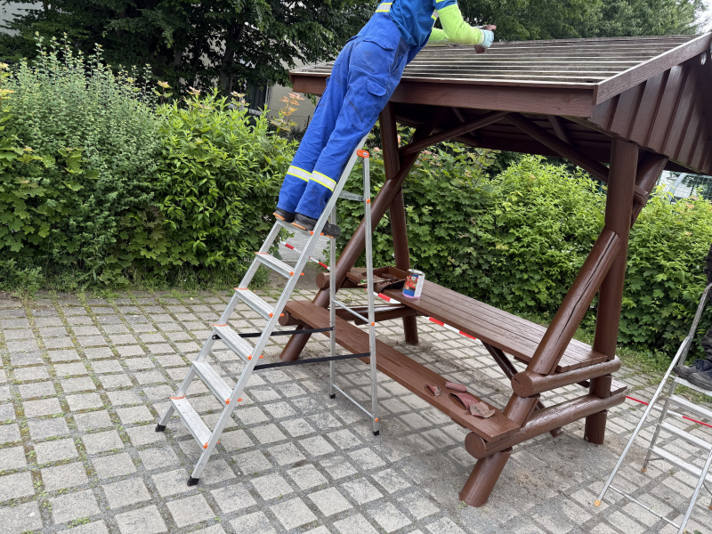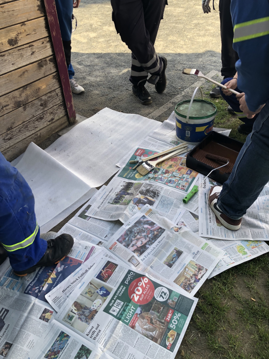 Verkaufshäuschen, Sitzraufe, Abstellflächen und Teile des Pizzaofens – alles aus Holz, alles wettergeplagt, alles dringend renovierungsbedürftig. Also: Alte Farbe runter, neue Farbe drauf – und das möglichst ohne sich gegenseitig anzupinseln. Das Ergebnis: Frischer Glanz, satte Farben und ein Pausenhof, der wieder einlädt. Nebenbei wurde so ganz nebenbei auch geübt, wie man Farbe ordentlich anmischt und gleichmäßig aufträgt – Learning by Doing!