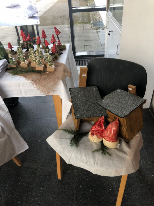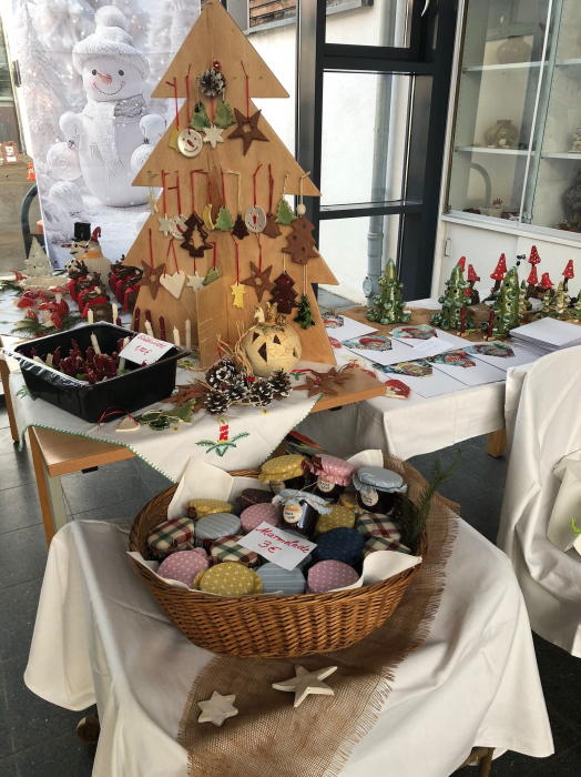 Nachdem die Einladungen verteilt waren, begann am Morgen des Adventsmarkts der gemeinsame Aufbau. Auf dem Schulhof und im Foyer entstanden zahlreiche weihnachtlich geschmückte Stände, an denen später liebevolle Handarbeiten, kulinarische Leckereien und kleine Überraschungen angeboten wurden.