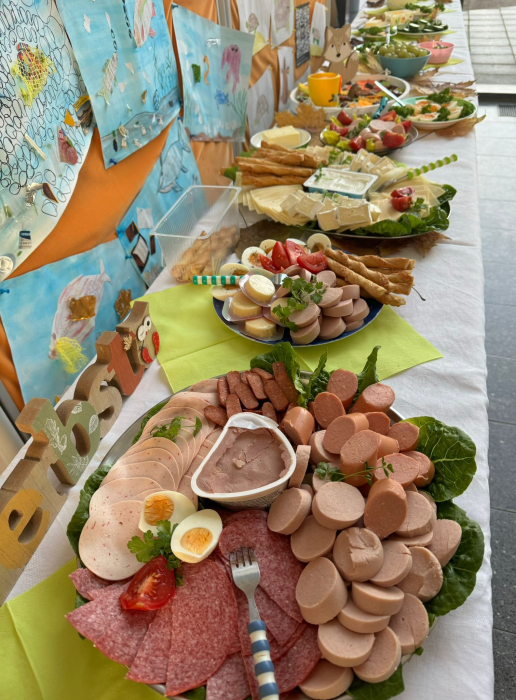 Am 09. Oktober 2025 feierten die Unterstufenklassen ein ganz besonderes und gemeinschaftliches Frühstück zum Erntedankfest. Mit viel Engagement, Vorbereitung und liebevollen Details entstand ein herbstliches Buffet, das nicht nur köstlich aussah, sondern auch den Gedanken des Teilens und Dankens wunderbar widerspiegelte. Die Klasse 1 brachte eine bunte Vielfalt an Obst und Gemüse mit – frisch, knackig und perfekt zum Start in den Morgen. Die Klasse 4 bereitete appetitliche Käse- und Wurstplatten vor, die das Buffet herzhaft ergänzten. Für köstliche Quarkdips sorgte die Klasse 3, die mit ihren verschiedenen Varianten richtige Geschmackshighlights setzte. Und die Klasse 2 kümmerte sich um eine Auswahl verschiedener Marmeladen, bestellte die Brötchen und bereitete zusätzlich einen wunderbar süßen Quark zu. Die Erwachsenen rundeten das gemeinsame Fest ab, indem sie die Tische herbstlich und liebevoll dekorierten – ganz im Zeichen des Erntedanks. Das Ergebnis: Ein Frühstück, das allen prima gefallen hat, den Austausch zwischen den Klassen stärkte und für viele schöne Momente sorgte.