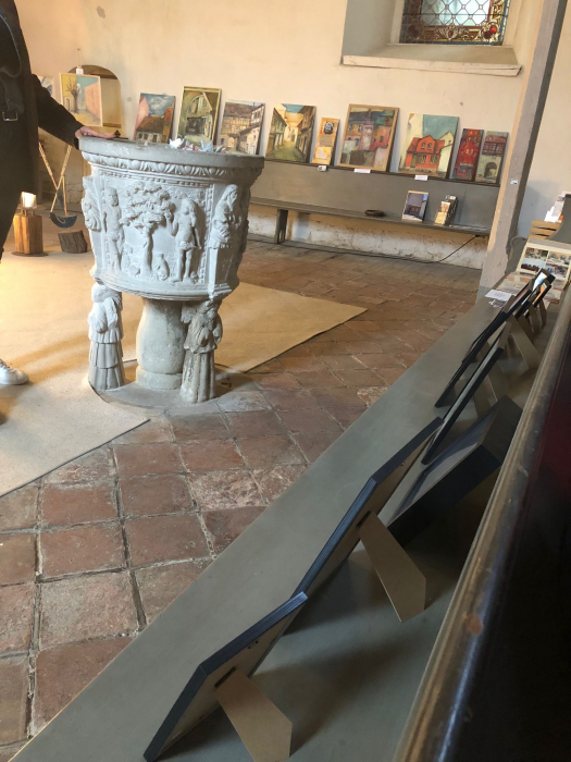 Schon beim Betreten spürten wir die besondere Atmosphäre dieses über 900 Jahre alten Gebäudes. Besonders beeindruckt haben uns die bunten Mosaikfenster mit den Aposteln Paulus und Petrus, der kunstvoll gestaltete Altar und das alte Taufbecken.